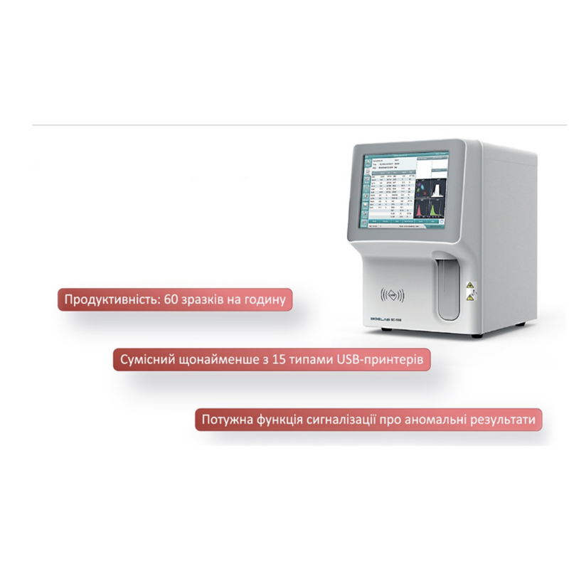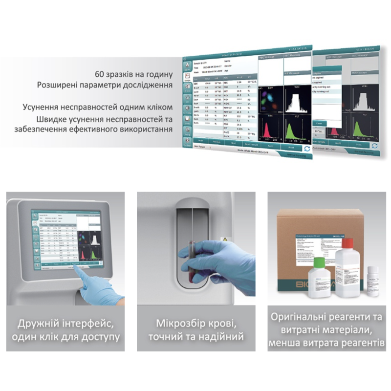 - Диференціація лейкоцитів на 5 фракцій, 25 реестрованих параметрів та 12 дослідницьких параметрів, 3 гістограми, 3 діаграми розсіювання DIFF та 1 діаграма розсіювання BASO