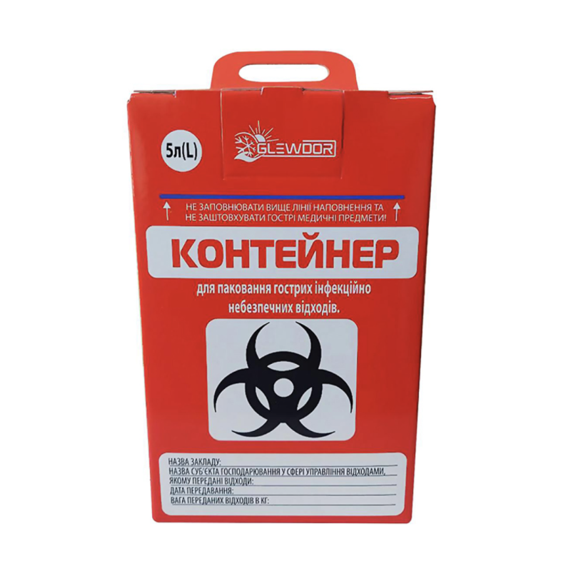 - Спеціалізований одноразовий контейнер об'ємом 5 л призначений для безпечного збору, зберігання та подальшої утилізації інфекційно небезпечних відходів (клас B/C). Це незамінний елемент оснащення маніпуляційних кабінетів, лабораторій та операційних блоків.