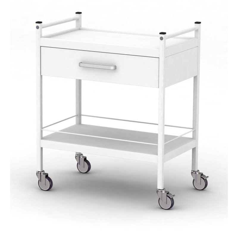 Стіл комплектується: 2-ма полицями з листового металу, одним металевим висувним ящиком (направляючі повного висування), розміщеним під верхньою полицею, і 2-ма ручками з боків для зручності переміщення. Верхня полиця має профільний край, а нижня полиця має огороджувальний бар'єр, що оберігає медикаменти та інструменти від випадкового падіння.